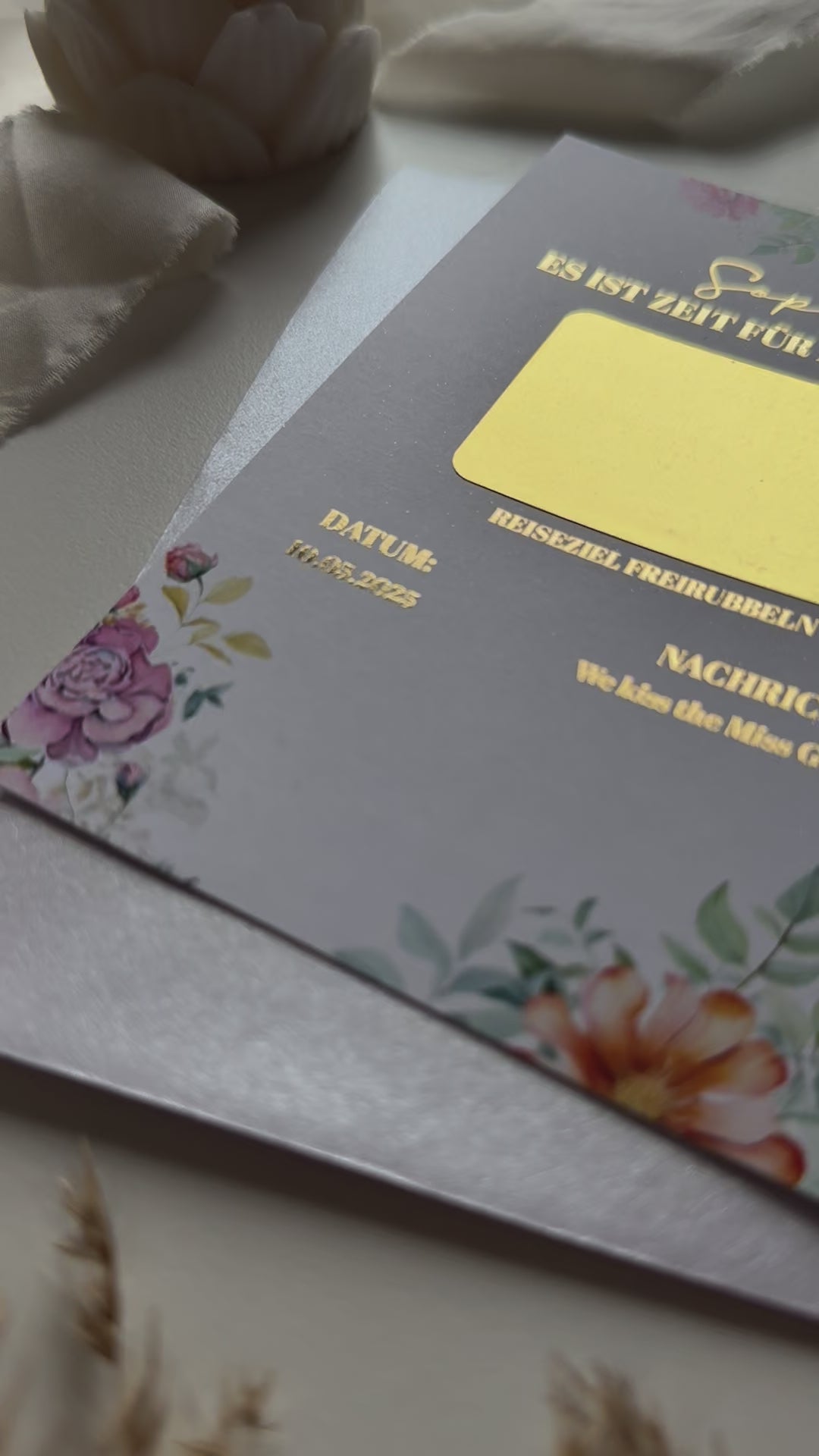 Surprise the bride with a beautiful personalized travel voucher with a destination to scratch off under a scratch-off field in boarding pass style. A great and unique addition to your surprise and a gift idea for every bachelorette party.